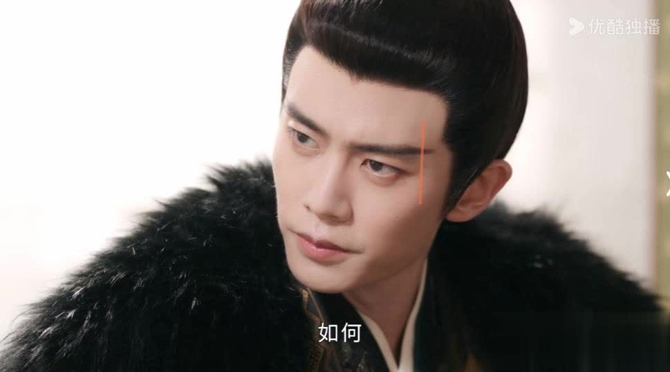 再说说化妆,任嘉伦这眉毛是怎么回事?画得也太长了吧,直接要飞出脸部去了。一般眉毛就比眼尾稍长一点,比如下面第一张,我们可以清楚地看到任嘉伦原来眉梢地位置,但是化妆比原来地眉毛长了大概一厘米。也许造型师想用这样的方式表现萧焕的帝王尊严,可是反倒看着很出戏,尤其是正面看,像是两条细麻绳把脸分成了两半。